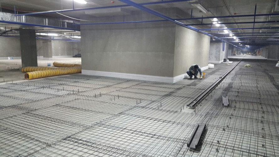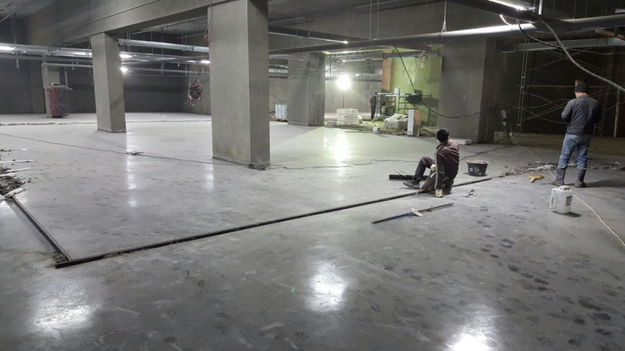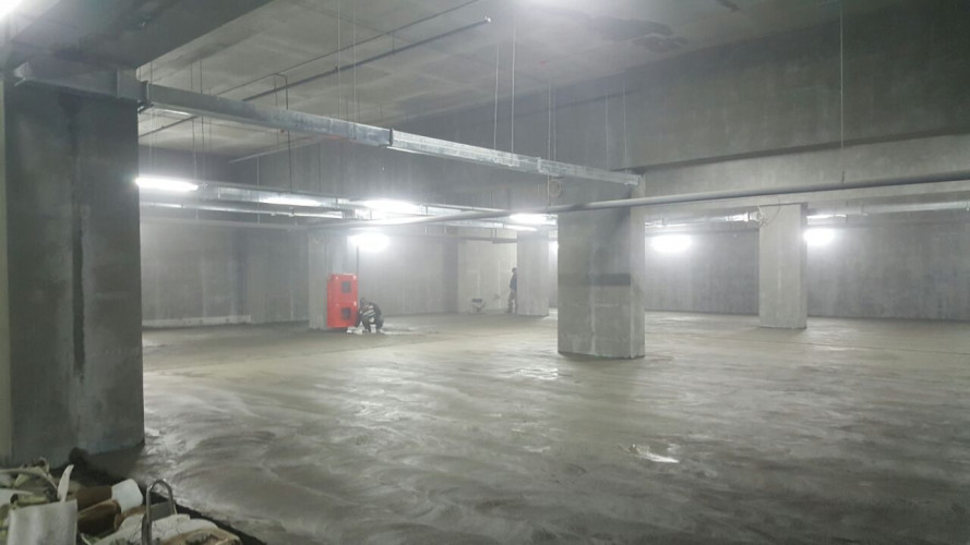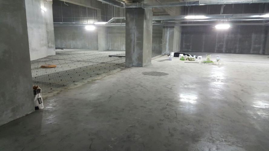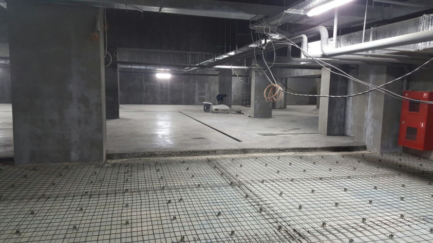 На фотографиях все виды работ по выполненным «БЕТОН ГРАД» топпинговым полам на подземной двухуровневой автостоянке расположенной под улицей Татищева в г. Екатеринбурге»: грунтовка и обеспыливание, укладка сетки, бетонирование, нарезка швов.